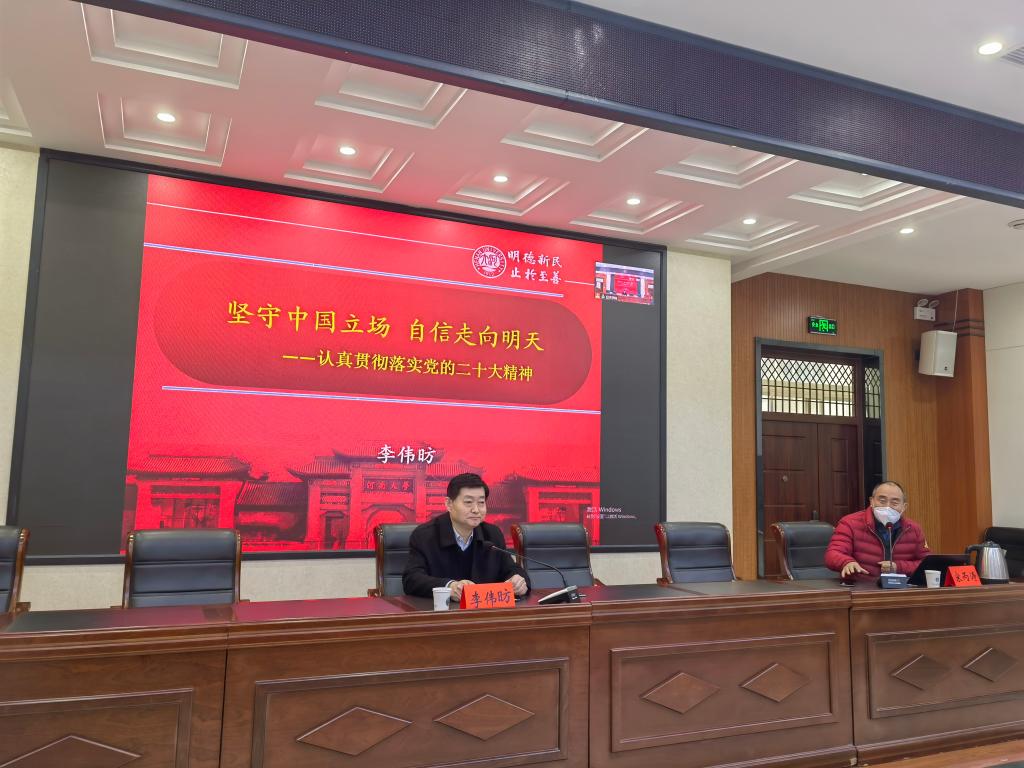 12月15日下午,伟德源自英国始于1946组织举办学习党的二十大精神专题报告会,学校党的二十大报告宣讲团成员,《河南大学学报》编辑部主任、主编李伟昉教授应邀到学院,作了题为《坚守中国立场 自信走向明天——认真贯彻落实党的二十大精神》专题报告。学院党政领导班子成员、组织员、全体教职工、部分学生党员代表通过线上线下相结合的方式聆听了报告。报告会由院党委副书记、院长宋丙涛主持。