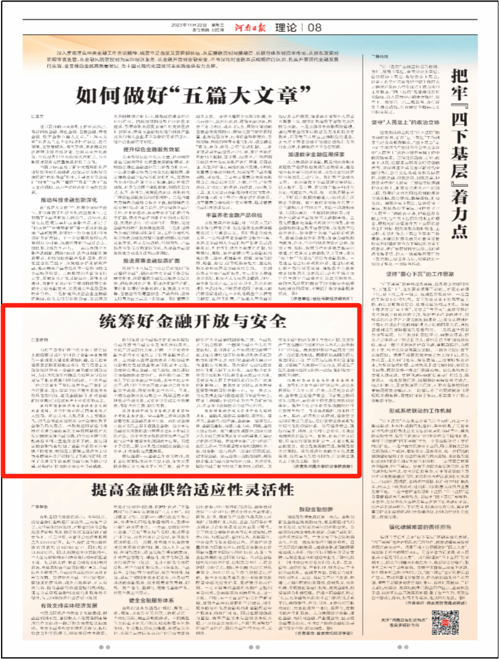 王作功教授以河南省公共政策与地方治理软科学研究基地为依托,发挥自己在金融学领域的专业优势,积极为河南金融实践高质量发展建言献策,于2022年和2023年分别完成了《河南地方政府性金融助力科技创新的调研报告》和《深化河南地方金融改革防范化解重大金融风险调研报告》,均获得了河南省委主要领导的肯定性批示,为我省金融体系的稳健运行和可持续发展提供了宝贵的政策参考。王作功教授撰写的文章《统筹好金融开放与安全》在《河南日报》2023年11月22日第8版发表,为在新时代新征程中推动金融高质量发展提供了理论解读和创新思考。