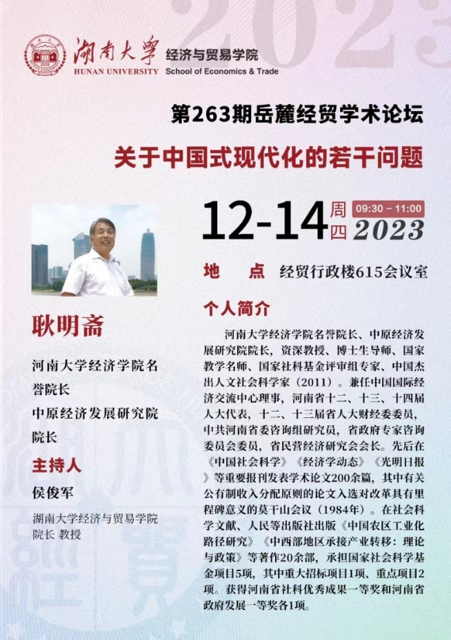 12月14日,耿明斋受邀到湖南大学经济与贸易学院开展学术讲座,经济与贸易学院院长候俊军教授主持,部分教师和硕博研究生参加。耿明斋以“关于中国式现代化的若干问题”为题做了精彩演讲。他首先澄清了现代化的概念,认为现代化包含器物和制度两方面,现代化是由技术进步和效率驱动的结构演化过程,也是农耕文明向现代工业文明转型的过程。在此基础上,他提出了现代化的六大特征和中国式现代化的五大特点,分析了中国式现代化的目标任务和前进道路上面临的挑战。演讲受到了师生的热烈欢迎和高度评价。