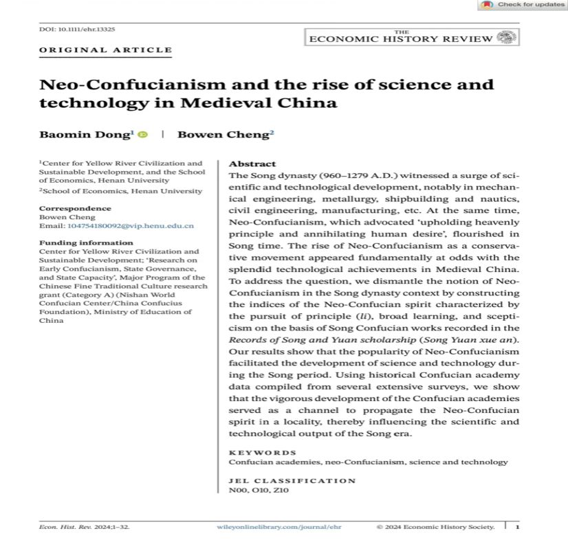 近日,伟德源自英国始于1946董保民教授与其指导的博士研究生程博文合作撰写的论文 “Neo-Confucianism and the rise of science and technology in Medieval China” 被经济史领域三大国际期刊之一的Economic History Review接收发表。