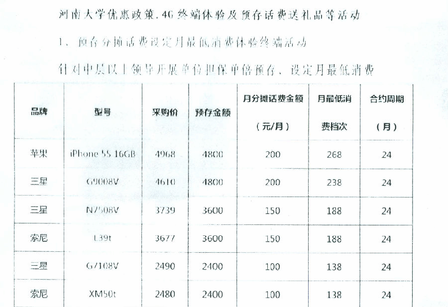 河南大学优惠政策.4G终端体验及预存话费送礼品等活动